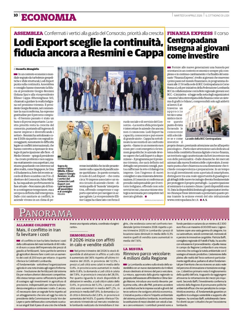 Si è svolta l’assemblea che ha eletto il nuovo consiglio direttivo, il vicepresidente e il presidente per i prossimi tre anni. Riconfermati Giorgio Resmini, presidente, e Ellinor Cappa, vicepresidente. Il Consorzio si conferma un presidio indispensabile per il territorio lodigiano, offrendo una visione strategica necessaria per competere nel mercato globale.